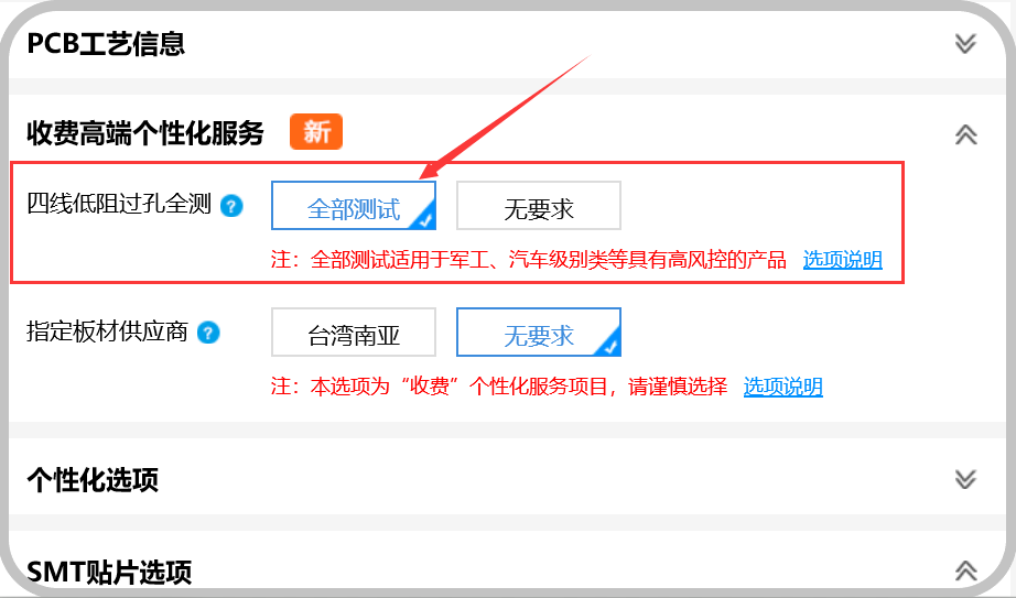 嘉立创在提供了四线低批量性管控的同时,也提供了客户的全部进行低阻测试的高端选项,
