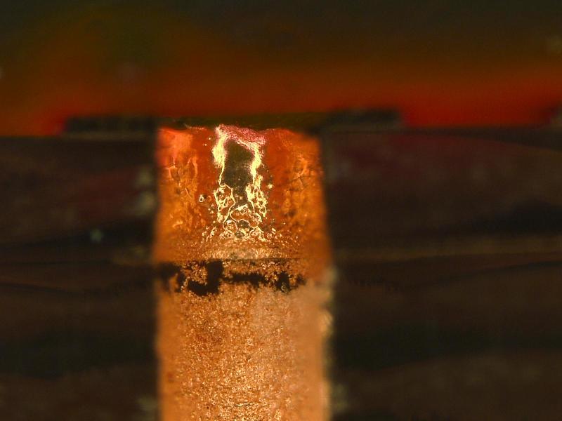 上图中的孔,过孔中间似连非连,在99%的PCB工厂包括2019年5月前的嘉立创都是采用普通的飞针测试机及通用测试机进行测试,根本就测不出上面图片的”隐性坏孔“,这个孔只能用“四线低阻测试机”测出,因为“四线低阻测试机”测试精度能达到微欧级别,而普通的“飞针测试机及通用测试机”只能达到欧姆级别,是好孔还是隐性坏孔则全部体现在电阻值的大小上,如果一个过孔达到了4微欧则一定是隐性坏孔,而4微欧对于普通的针测则是好孔,万用表对于隐性坏孔也是无能为力,这就是隐性坏孔的可怕之处,所以军工板及汽车板则必须全部低阻测试!