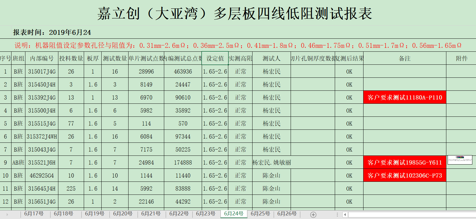 四:批量性四线低阻管控: 嘉立创工厂每天四线低阻测试管控记录报告:
