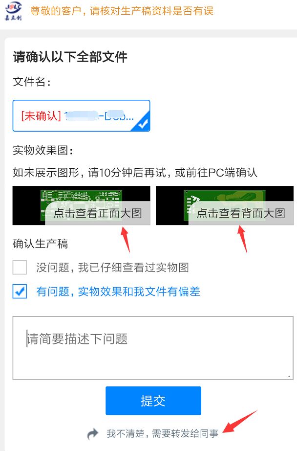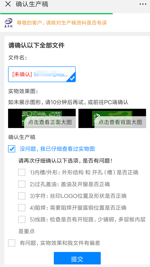 生产稿确认确都是在电脑端确认,而做生产资料需要一段时间,所以有时候经过不在公司内导致无法确认,嘉立创现在直接把生产稿确认通过微信发到了手机端,能快速方便的确认生产稿!