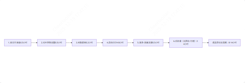 树脂3D打印的流程高度简化,从设计师完成3D建模到拿到成品,仅需6步,总耗时8-14小时,完全可实现“当天启动、当天交付”。