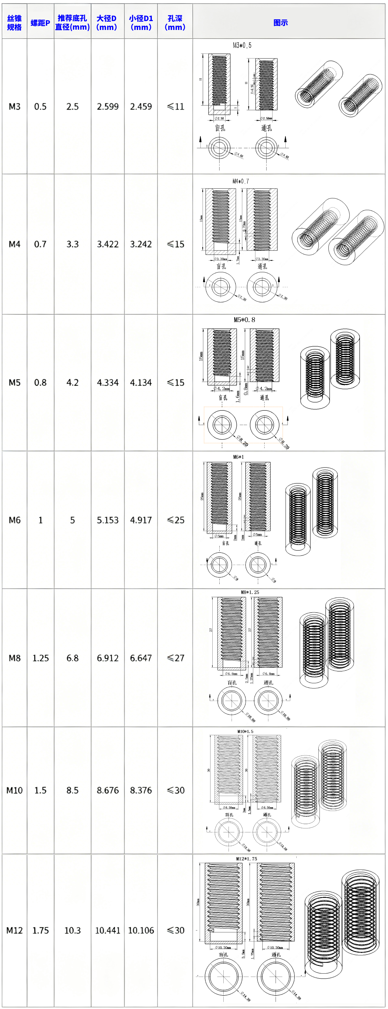 5、支持公制丝锥型号及对应底孔尺寸